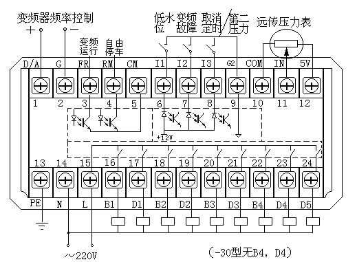 變頻泵控制輸出,接交流220V接觸器,觸點容量5A。當驅動大功率接觸器時,請加中間繼電器,以下同。 |